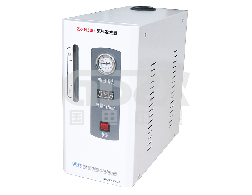 ZX-H300氫氣發生器主要有電解池單元、電氣控制元件(包括開關電源、壓力流量自動調節和流量顯示部分)、氣路單元(包括氣液分離裝置、壓力指示和氣體凈化)等部分組成。電解池為筒式結構,采用先進的膜滲透技術。工作原理為在電場的作用下,電解池陽極產生氧氣陰極產生氫氣,氧氣經液路被釋放到大氣中,而氫氣則進入凈化系統后輸出。
