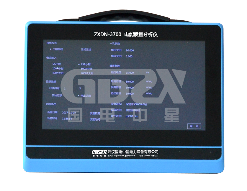 ZXDN-3700電能質量分析儀是一種集電能質量分析、電參量測試、電力矢量分析為一體的多功能測試儀器。該儀器支持50Hz/60Hz電網工頻系統測量,它可記錄分析現場的諧波、電壓、電流、頻率、波動、閃變、電壓驟升驟降、功率和三相不平衡等所有電能質量參數,具備高級電能質量測量功能,同時提供了專業的上位機分析軟件進行二次分析,為用戶提供最準確的電力故障診斷分析。配備高精度、高線性度的電壓互感器和鉗形電流互感器,使儀器對各種參量的測量精度很高,同時現場接線簡便。采用進口大屏幕彩色液晶作為顯示器,觸摸屏操作,中文操作界面并配有漢字提示信息、多參量顯示的液晶顯示界面,人機對話界面友好,向量圖顯示及接線判斷為檢查電路的正確性提供了可靠的依據。儀器內置大容量掉電不丟失數據存儲器,可將現場測試數據海量保存,為上位機軟件的分析提供可靠的現場數據。